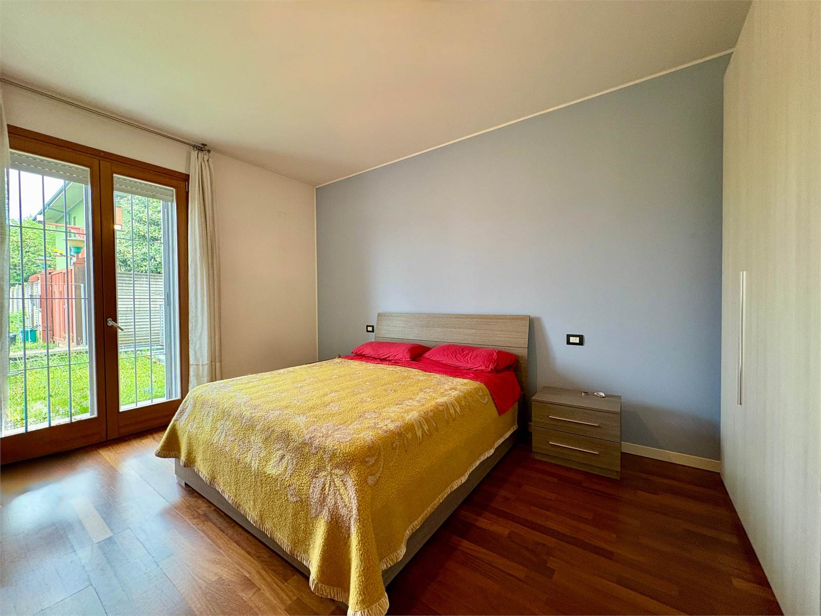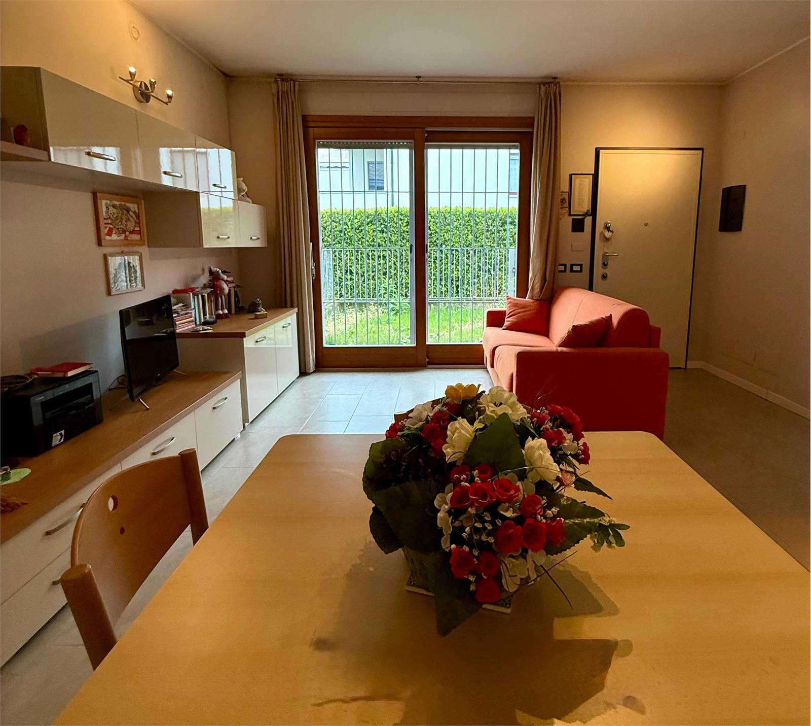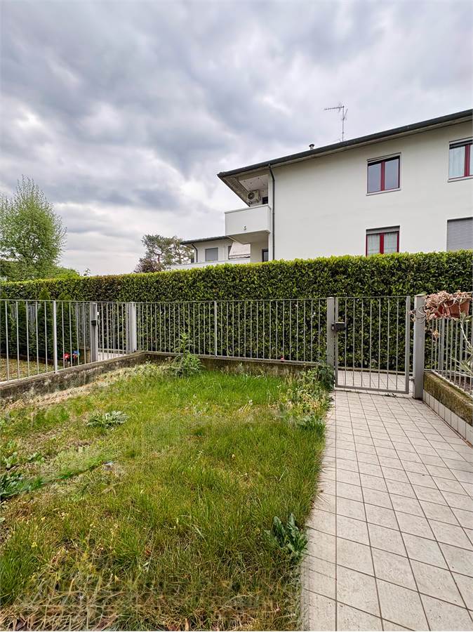 L’appartamento è composto da un ampio soggiorno con cucina a vista e accesso diretto al giardinetto frontale, un comodo disimpegno, una spaziosa camera matrimoniale con uscita sul giardinetto retrostante e un bagno finestrato dotato di ampia doccia.