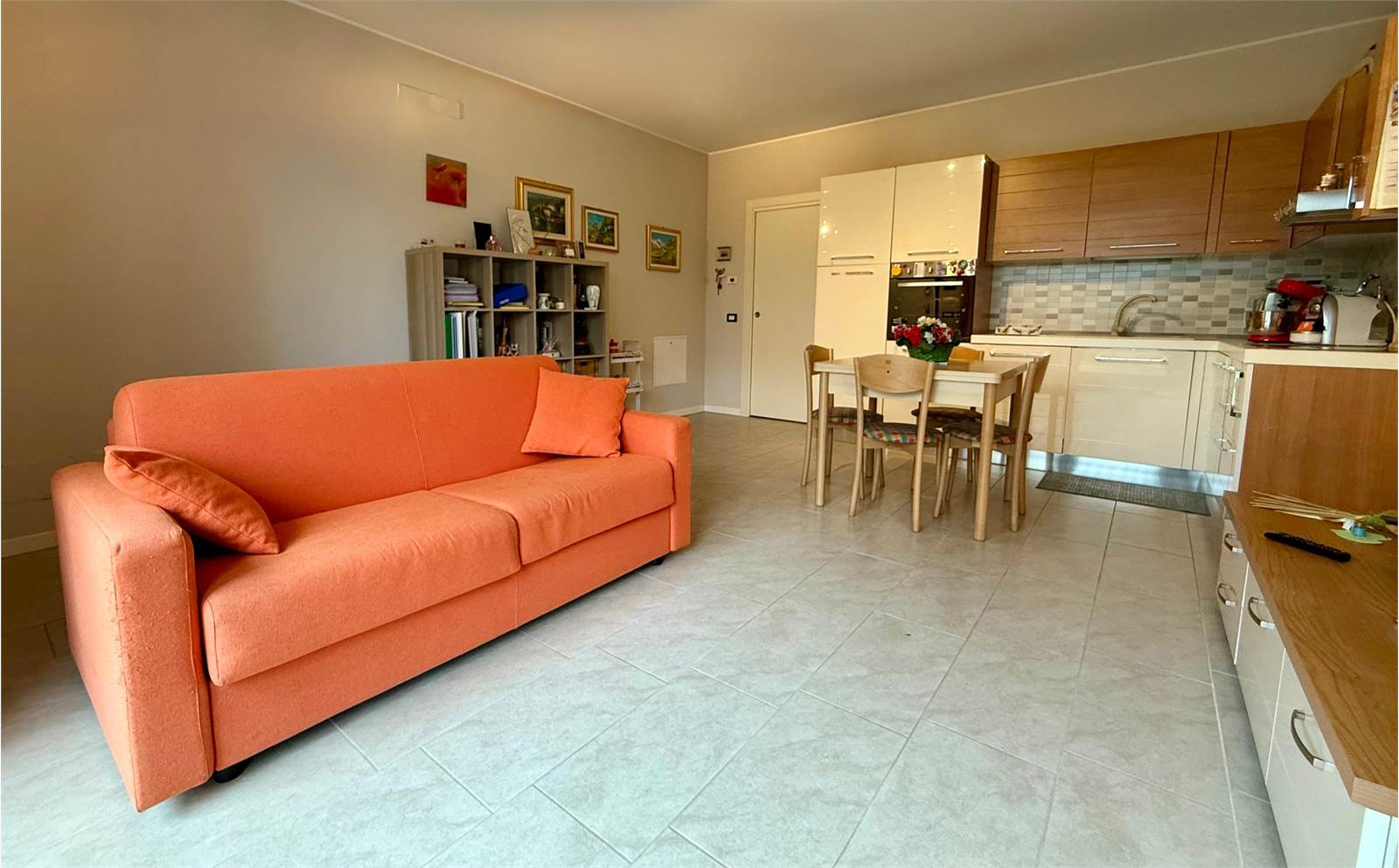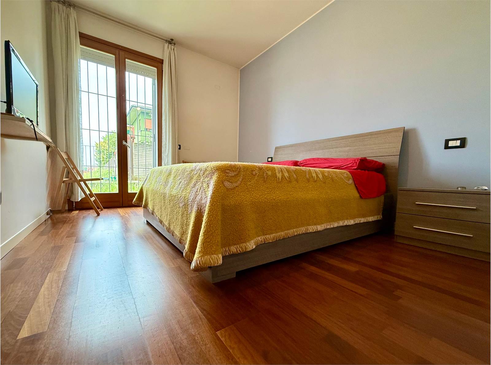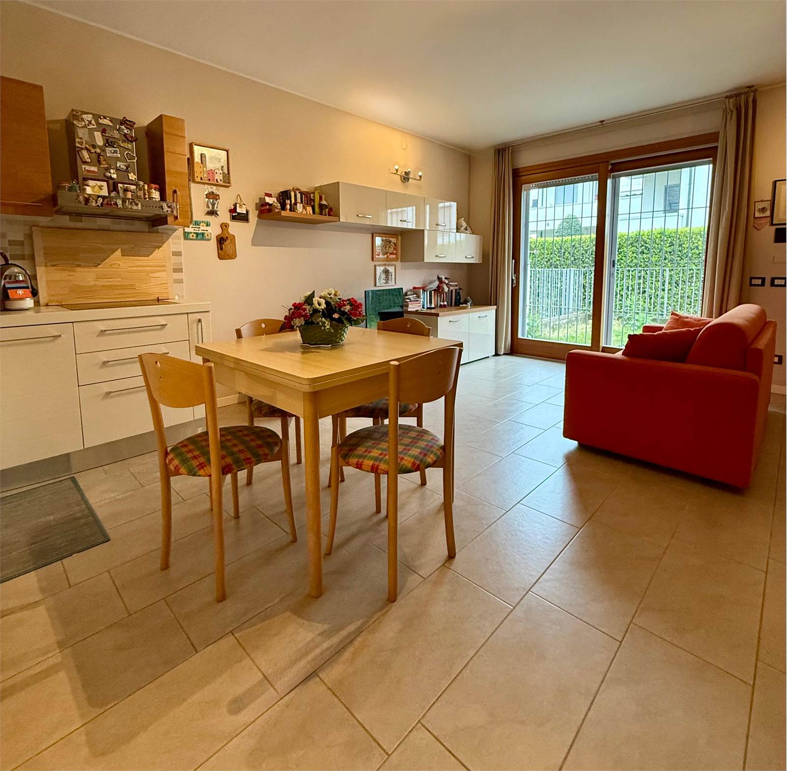 L’appartamento è composto da un ampio soggiorno con cucina a vista e accesso diretto al giardinetto frontale, un comodo disimpegno, una spaziosa camera matrimoniale con uscita sul giardinetto retrostante e un bagno finestrato dotato di ampia doccia.